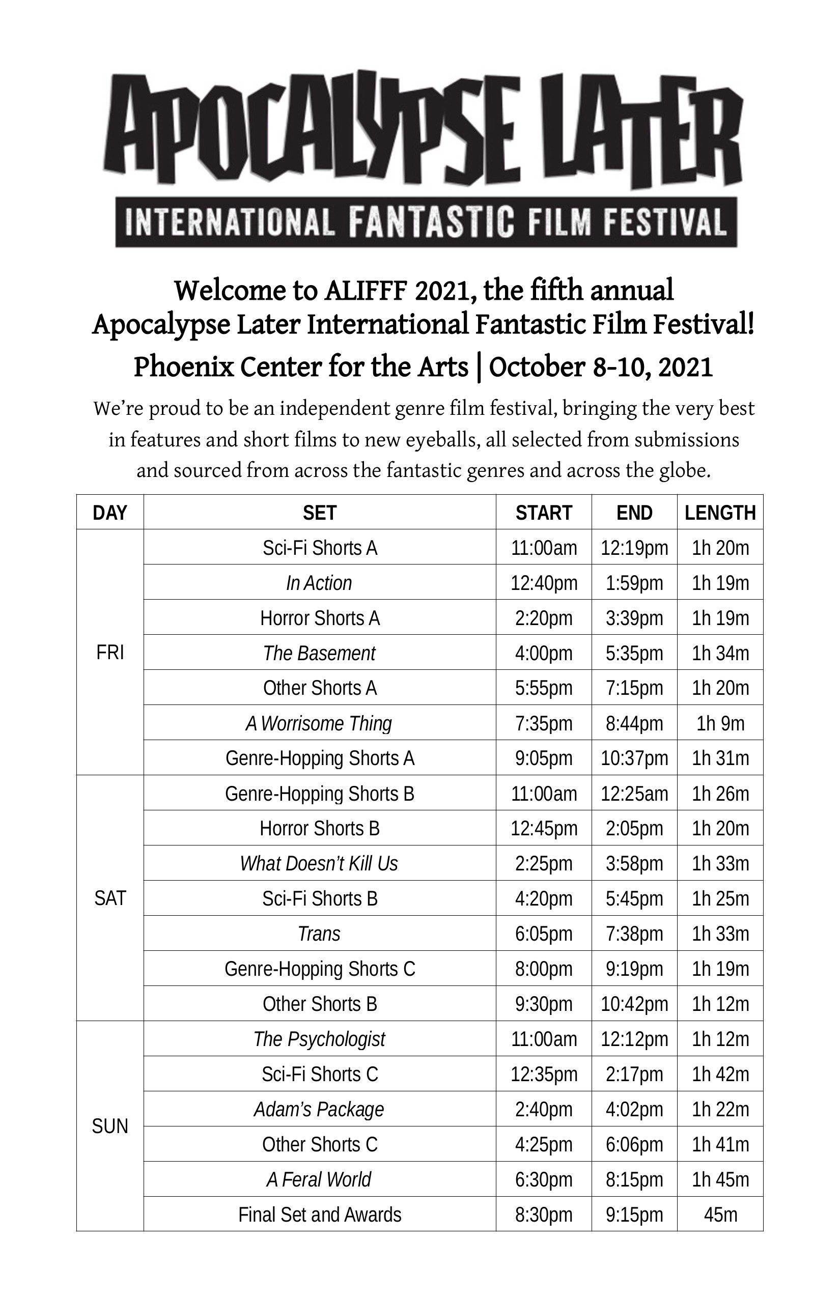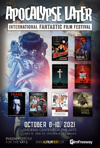 This is an archive page. For the current year's festival, please visit our main page. The fifth annual Apocalypse Later International Fantastic Film Festival (ALIFFF 2021) was held in the 3rd Street Theater at the Phoenix Center for the Arts from Friday 8th to Sunday 10th October, 2021. Graphics | Overview | Publications | Schedule | Awards