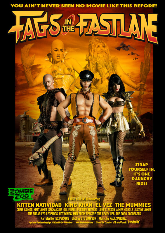 Fags in the Fast Lane89:00, Australia, dir: Josh Sinbad Collins When Beau and his herculean sidekick set off to avenge a spree of violent attacks on his fellow gays, he is waylaid on a vital mission for his beloved mama, Kitten, when her GILF bordello is robbed by the giantess leader of a grotesque burlesque show. With the help of a lethal cross dressing Persian Princess and a Bollywood eunuch assassin, this unlikely team of avengers set off to retrieve the lost booty in a full-throttle, rock n roll feast of camp destruction and dangerous dance numbers. Will they be able to recover Kitten's beloved jewels and magical golden phallus? They'd better! Featuring Kitten Natividad, King Khan and El Vez and with music from Sugar Fed Leopards, Hot Wings, Men from SPECTRE, The Seven Ups and The Gogo Goddesses. Official trailer at YouTube. |