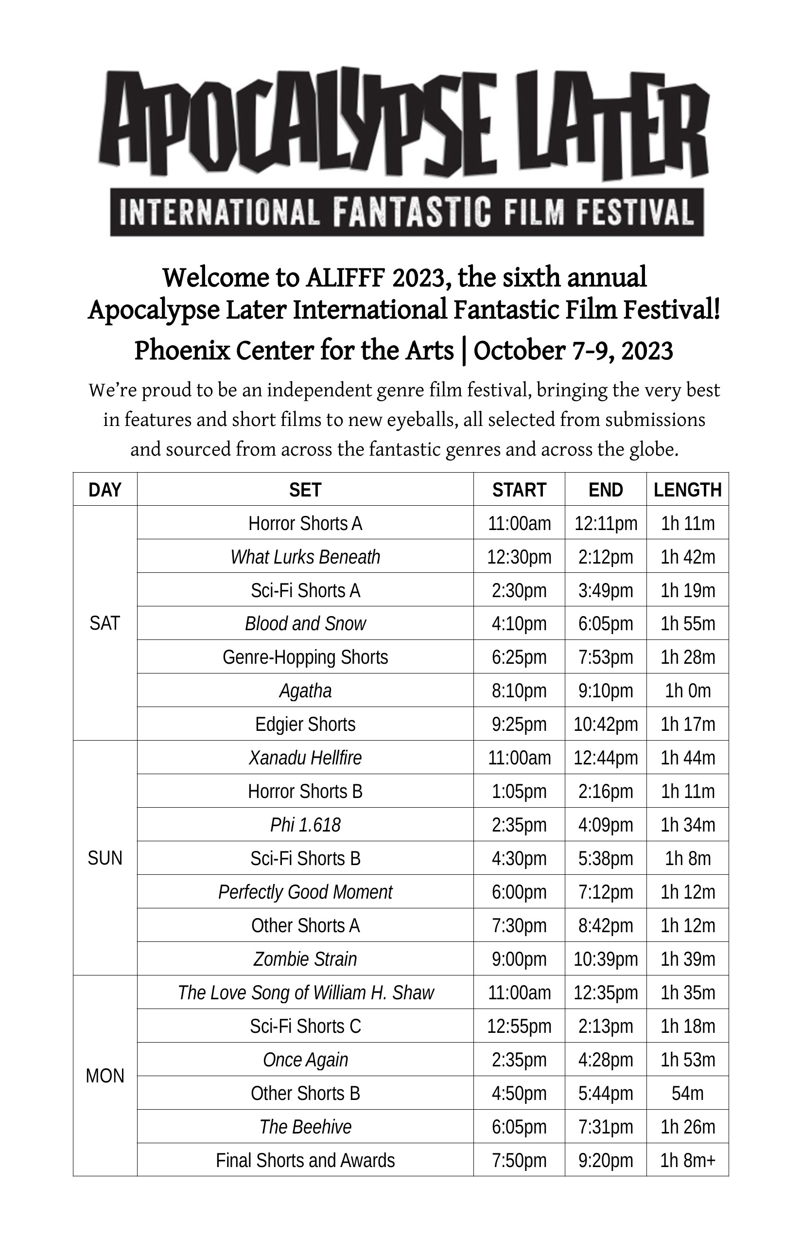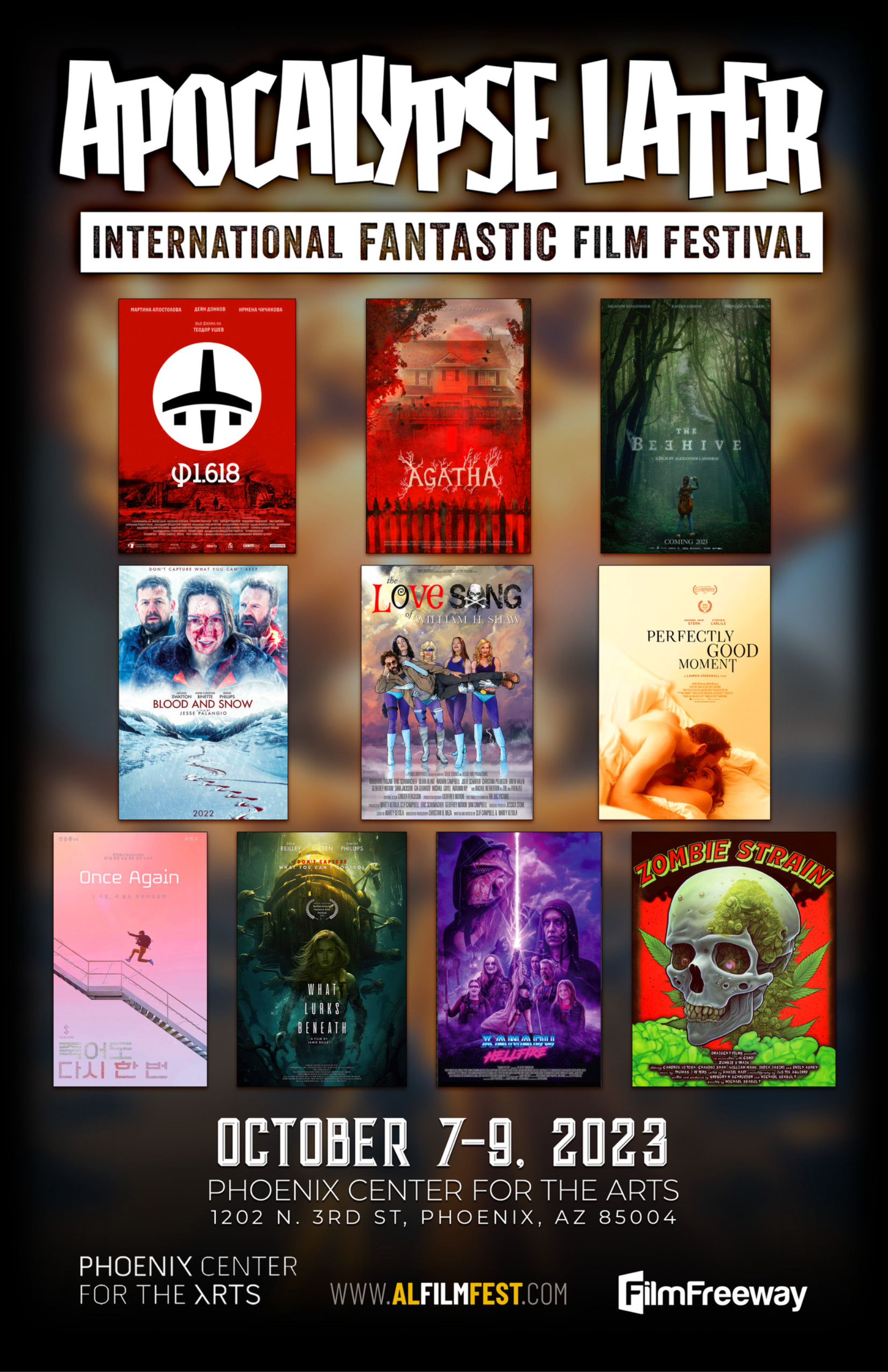 The sixth annual Apocalypse Later International Fantastic Film Festival (ALIFFF 2021) will be held in the 3rd Street Theater at the Phoenix Center for the Arts from Saturday 7th to Monday 9th October, 2021. TicketsTicket sales for 2023 are closed but they will be available at the festival! Price was $60 in advance for a full event pass. This includes access to all films over three full days. We will be selling concessions including our popular hot dog specials. Parking and popcorn are free! Safety ProtocolsThere will be no COVID restrictions this year. However, we do still recommend that you vaccinate to protect yourself and wear a mask if you wish to protect yourself and others.
